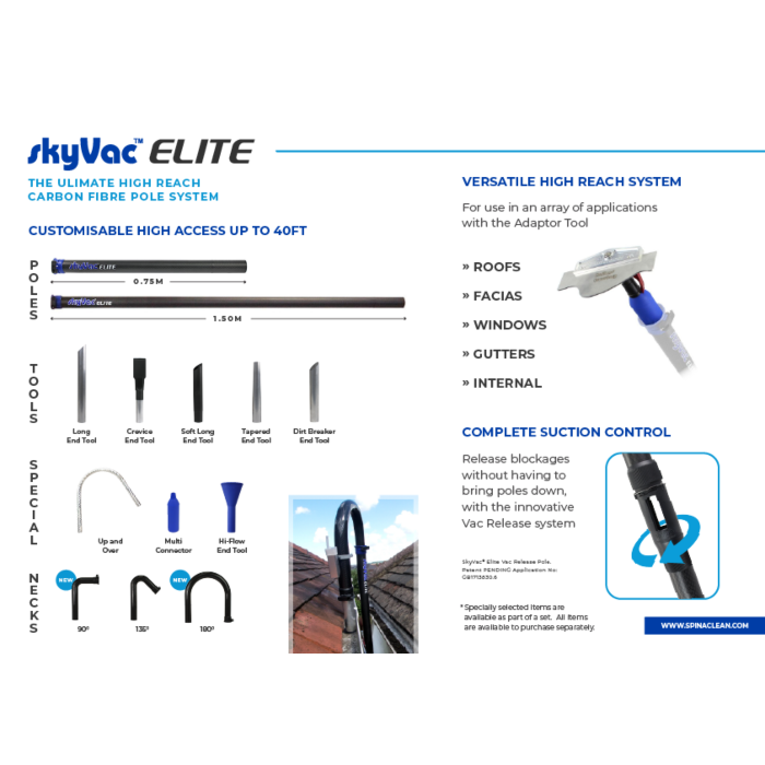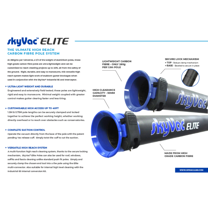 Obtenez la hauteur de travail idéale avec le demi-poteau SkyVac® Elite. D'une longueur de 750 mm (29,5 po), le manche en fibre de carbone ultra-léger est une solution parfaite. Pour un nettoyage efficace et performant en hauteur, fixez simplement et en toute sécurité le demi-poteau dans le système SkyVac® Elite.