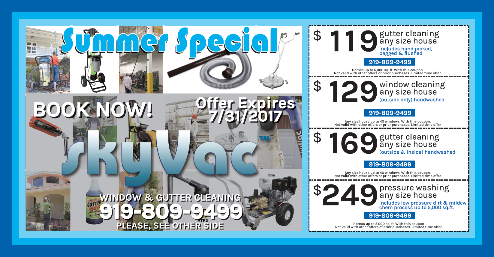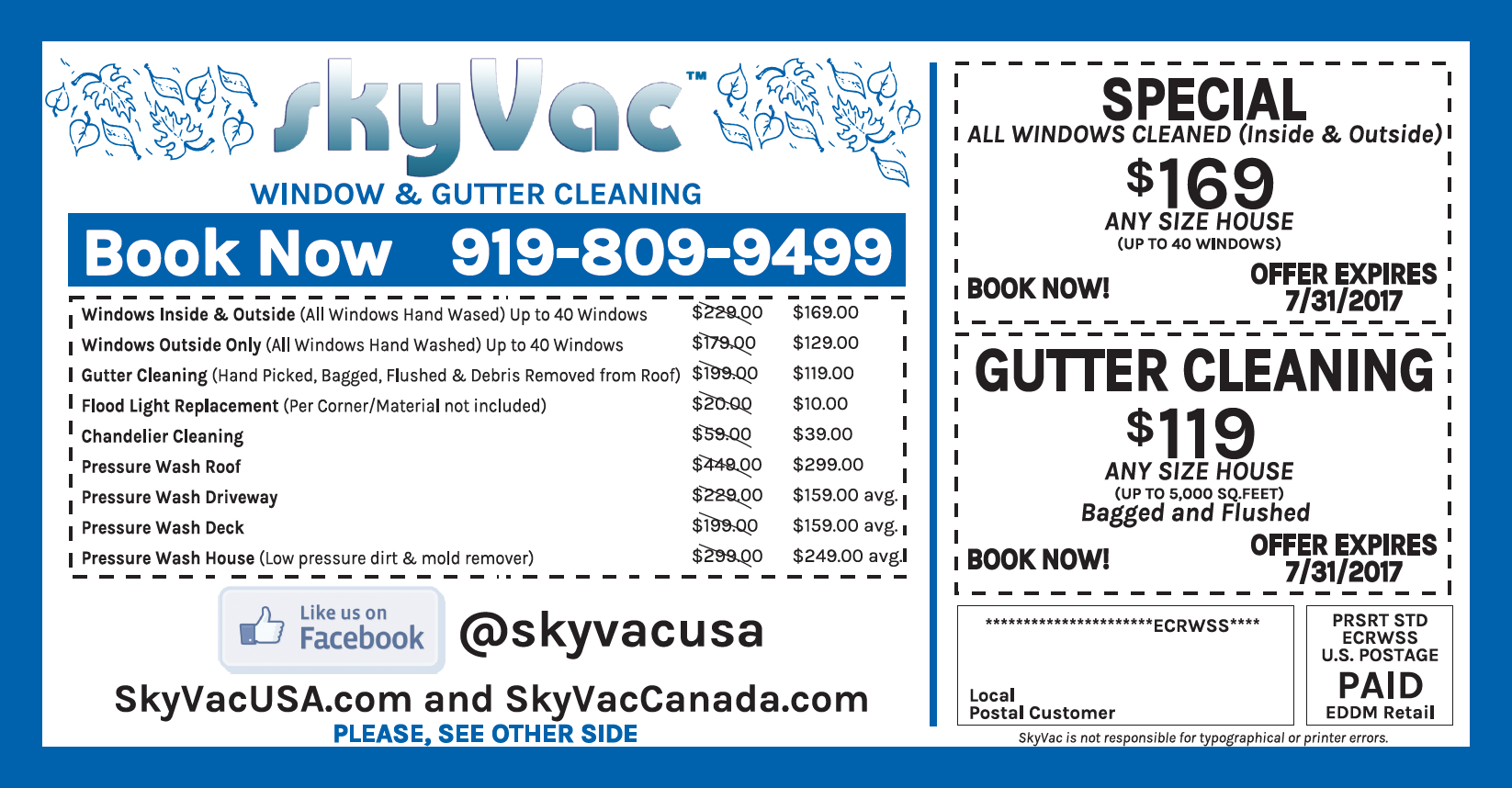 This mailer is 2-sided direct mail piece that offers a summer special for window and gutter cleaning.
